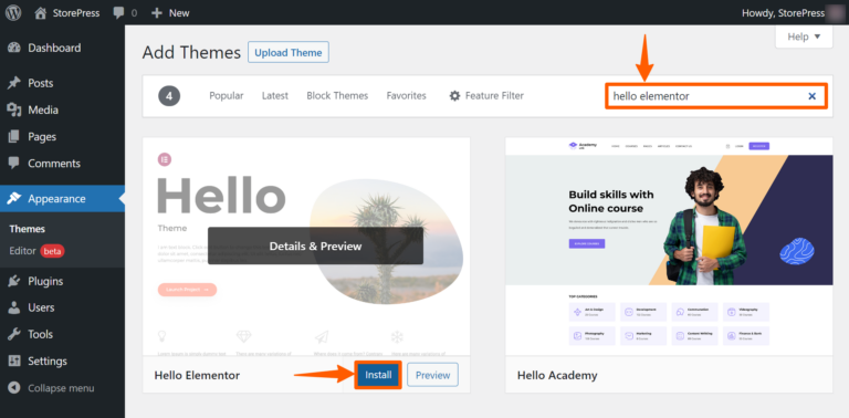 Step 3: Search for hello elementor, then install and activate it.
