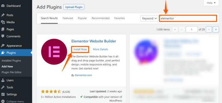 Step 5: Search for the plugin Elementor, then install and activate it.