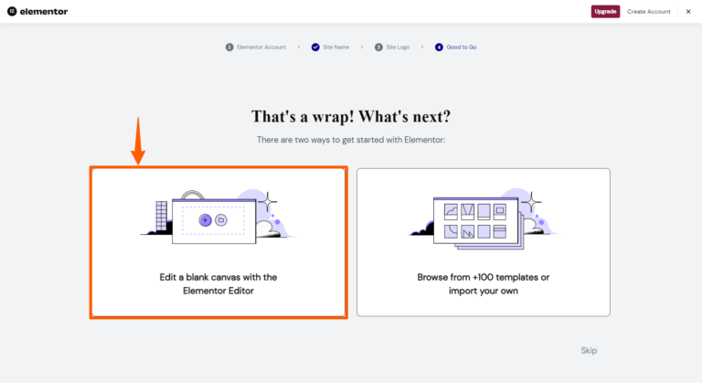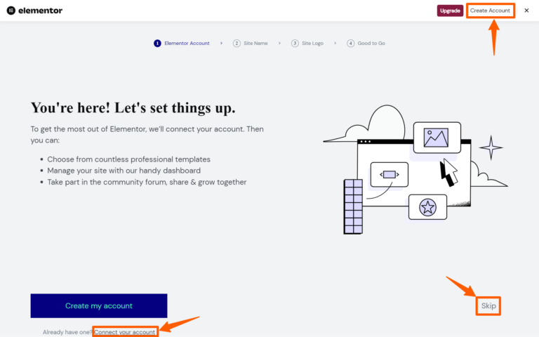 Step 6: Now, you’ll be redirected to the elementor’s page. If not, go to the plugin lists, and click on the Elementor settings. Now, click on Create Account to create a new account, click connect account if you already have an account, or click Skip to skip this section.
