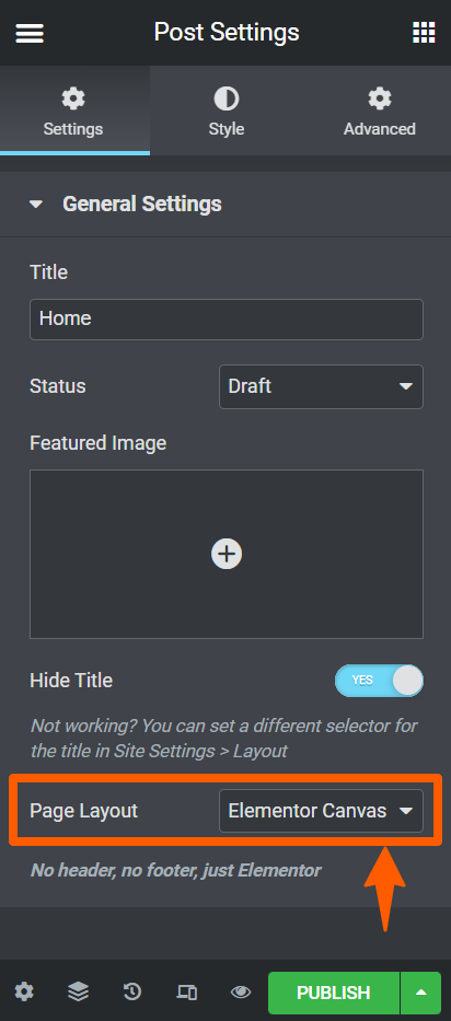 Step 10: Now, in this general setting section, you can choose the title of the page, its status of it, and the layout. Set the layout as Elementor Canvas.