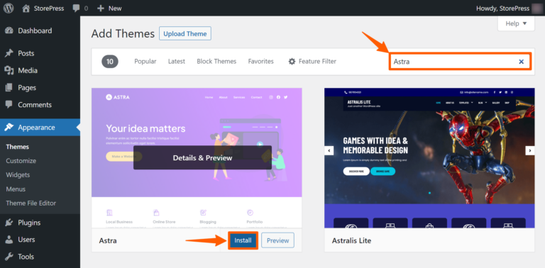 Step 2: Now, you’ll find the list of WordPress themes. Search for Astra, then install and activate the theme.