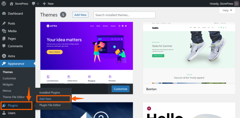 Step 4: Now, hover on the plugins, and click Add New.