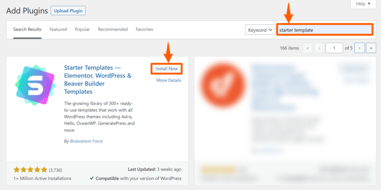 Step 4: On the top right, search for the starter template. Then install and activate that plugin.