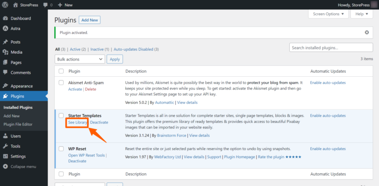 Step 5: You’ll be automatically redirected to the plugin page after activation. Find the starter template there, and click on See Library.