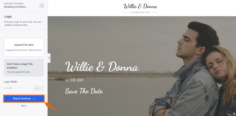 Step 8: After selecting a template, you’ll find the basic editing section. You can upload the logo and the width of the logo. If you don’t have a logo, don’t worry you can add it later. After that, click Skip & Continue.
