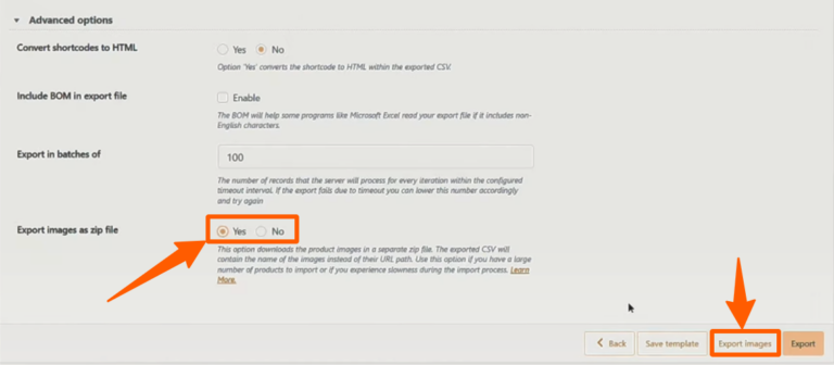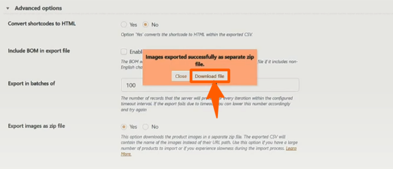 It’ll download the product images in a separate zipped file. There, in CSV, the URL of the image will be changed to the name of the image. We strongly recommend this if you’ve got too many products.