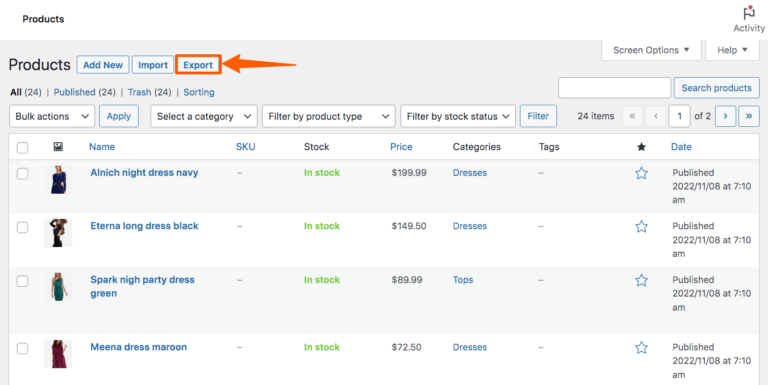Step 2: The list of products will appear. On that page, click on Export at the top of the page.