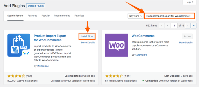 Step 2: Search for Product Import Export for WooCommerce. Then install and activate it.