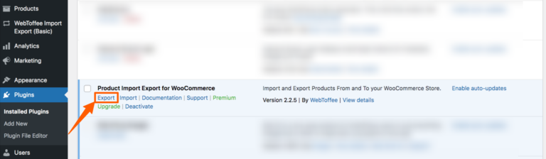 Step 3: After activating it, go to the Plugin list if not auto-redirected yet. Then click on Export under the plugin you just installed.