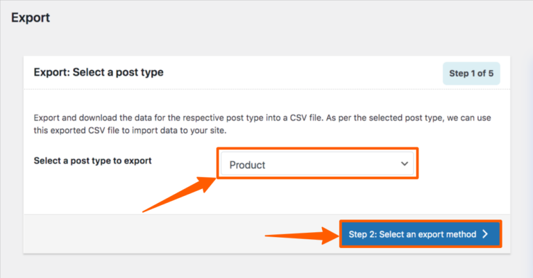 Step 4: A new page will appear where you can select the post type. Select the type of post you want to export, then click on Step 2: Select an export method.