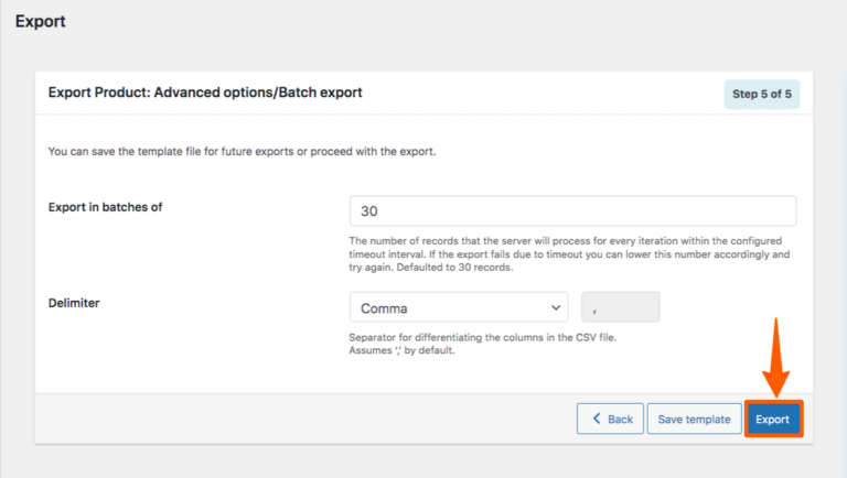 Step 8: Now, you can choose the number of batches and separator. After selecting those, click on Export to create the CSV file. You can also save the template by clicking on the Save Templates button at the bottom.